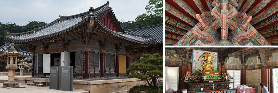 건물의 규모는 정면 3칸, 측면 2칸으로 다포식 팔작지붕이며 판문을 달아 출입하도록 하였다. 건물의 특징은 대들보 위에 두터운 솟을 합장재를 삼각형으로 짠 뒤, 그 부재 위에 장혀를 걸쳐 중도리ㆍ하중도리ㆍ종도리를 얹어 서까래를 받치고 있다. 이는 고식(古式)의 가구법(架構法)으로 흔히 볼 수 없는 형식이다. 또한 중앙에는 대들보 대신 코끼리와 호랑이가 서로 머리를 받쳐 지붕의 하중을 유지하고 있는 것도 매우 독특하다.